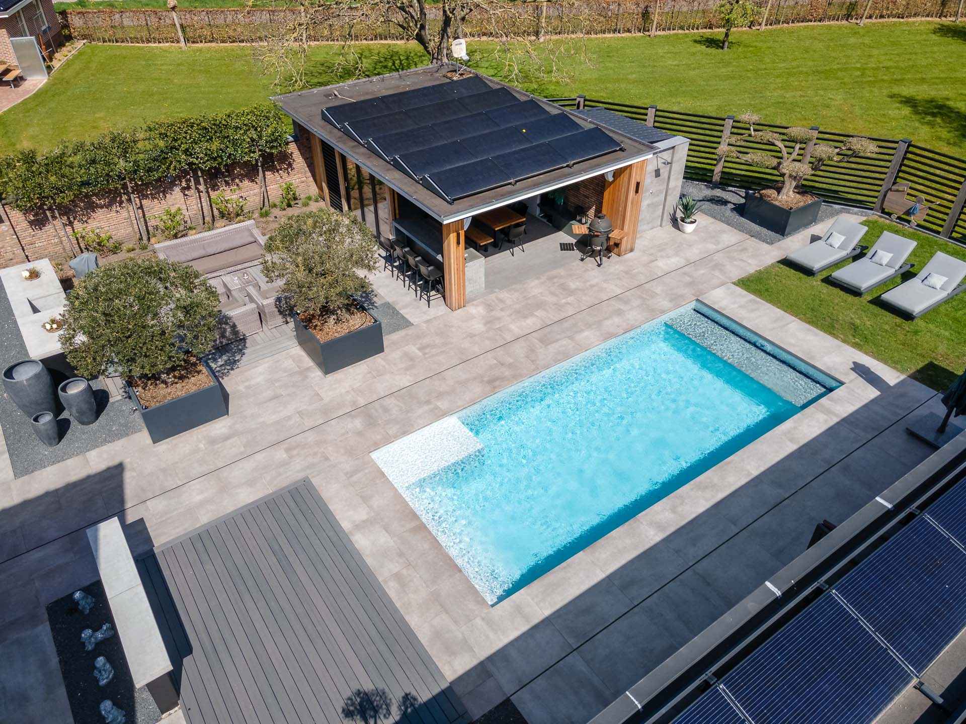 Voor een chique en mediterrane sfeer zijn tegels met marmer- of travertinlook een uitstekende keuze. Ze geven je terras een luxe uitstraling en zijn ideaal voor zonnige tuinen, zwembadranden en buitenruimtes met een zuidelijke flair.